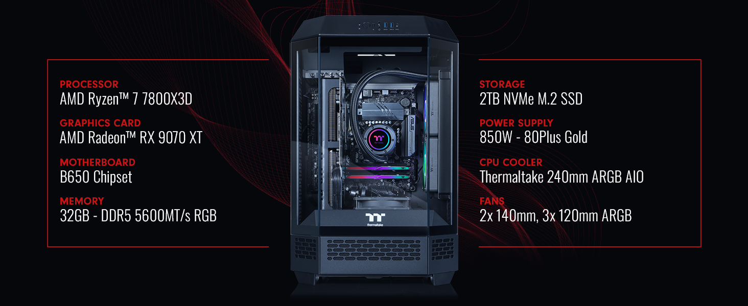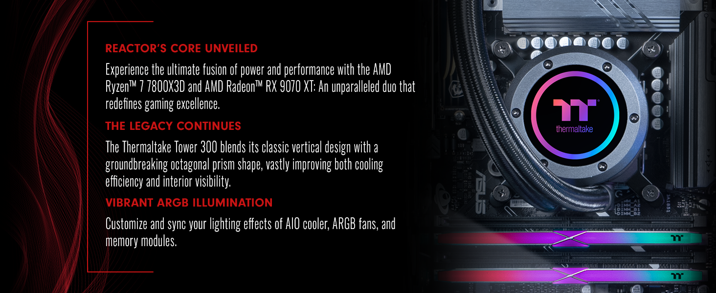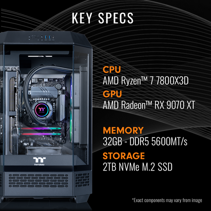 What better way to power your battle station than the Reactor 7897X. Its unique octagonal prism shape isn't just a statement piece; it's a testament to innovation, designed to offer superior cooling and performance. Powered by the formidable AMD Ryzen 7 7800X3D CPU and the revolutionary AMD Radeon RX 9070 XT GPU, this gaming behemoth delivers unmatched performance for an immersive gaming experience. With 32GB of high-speed 5600MT/s memory and 2TB of NVMe storage, say goodbye to load times and hello to instant action.
