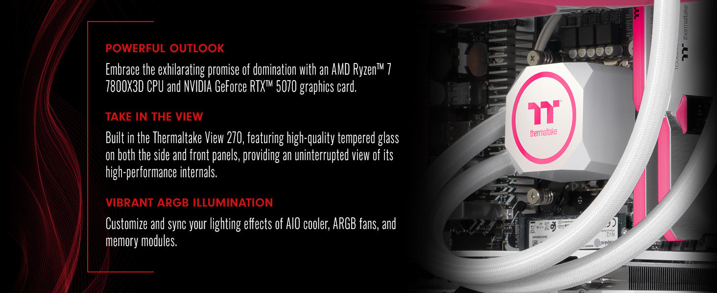 Discover the View series, where elite performance meets stunning design. Encased in edge-to-edge tempered glass, the View 7870H-270 features a dual chamber design that provides ample space to showcase its powerful internals, including an AMD Ryzen™ 7 7800X3D processor and NVIDIA® GeForce RTX™ 5070 graphics card. Experience blazing-fast load times with a 1TB NVMe SSD, seamless multitasking with 32GB DDR5 memory. Enhanced with a 240mm AIO cooler for optimal temperature control, the View Series combines aesthetic elegance with advanced gaming technologies.