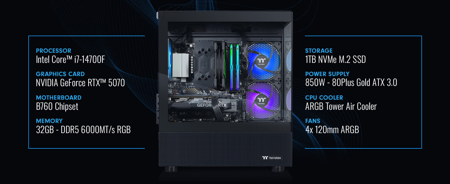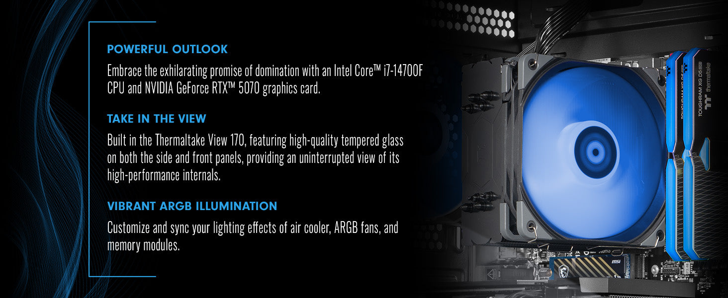 Discover the View series, where elite performance meets stunning design. Encased in edge-to-edge tempered glass, the View i1470-170 showcases its powerful internals, including an i7-14700F CPU and NVIDIA® GeForce RTX™ 5070 graphics card. Experience blazing-fast load times with a 1TB NVMe SSD and seamless multitasking with 32GB DDR5 memory. With a tower ARGB air cooler enhancing both visual flair and thermal efficiency, the View Series combines aesthetic elegance with advanced gaming technologies.