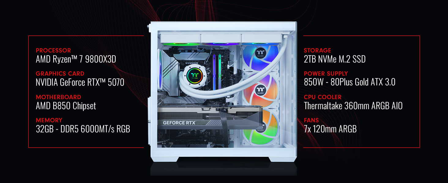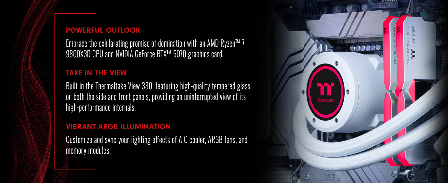 Découvrez la série View, alliant performances d'élite et design époustouflant. Entouré de verre trempé intégral, le View 9870S-380 est doté d'une conception à double chambre offrant un espace généreux pour mettre en valeur ses puissants composants internes, notamment le processeur AMD Ryzen™ 7 9800X3D et la carte graphique NVIDIA® GeForce RTX™ 5070. Profitez de temps de chargement ultra-rapides grâce à un SSD NVMe de 2 To, d'un multitâche fluide grâce à 32 Go de mémoire DDR5 et d'un contrôle optimal de la température grâce à un refroidisseur tout-en-un de 360 mm.