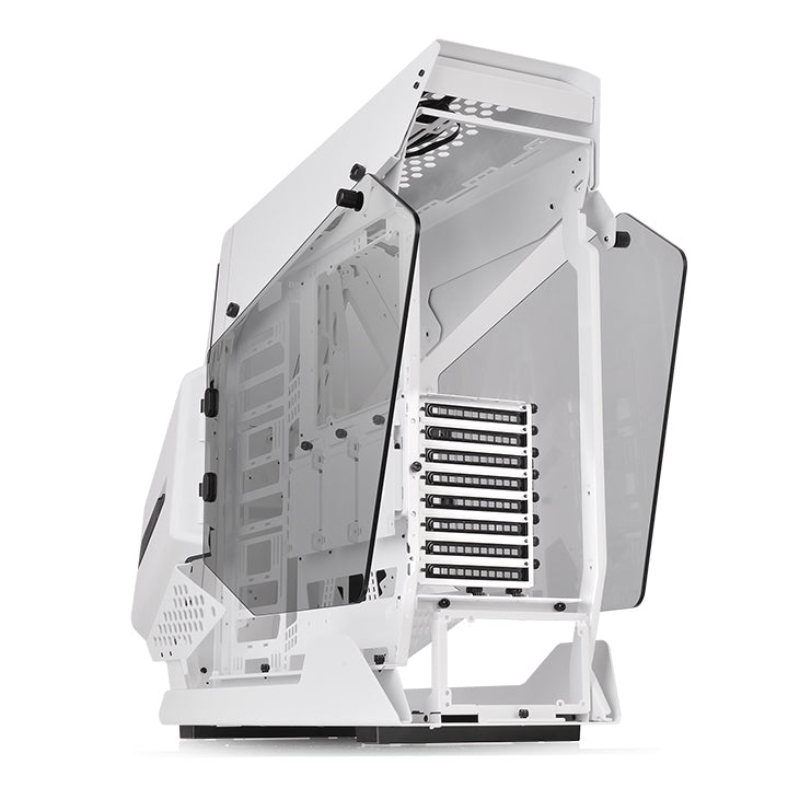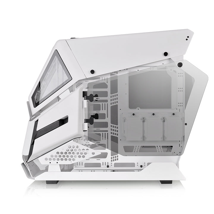 The AH T600 Snow full-tower chassis from the AH Series is forged with a sturdy, air-force styled architecture with two large 5mm tempered glass panels on the left and right sides, and three 3mm tempered glass windows on the front. I/O ports are located at the top-front panel with a futuristically designed power button. It is a newly designed open frame case, compared to Thermaltake Core P Series, which not only ensures outstanding ventilation but also enables users to demonstrate their DIY handwork and showcase their internal components. The AH T600 Snow supports high-end expansion that can hold up to four 120mm fans at the front and can fit our Pacific DP 100-D5 Plus RGB liquid cooling distribution plate. The AH T600 Snow Full Tower Chassis is one-of-a-kind that all users will notice, love, and desire.