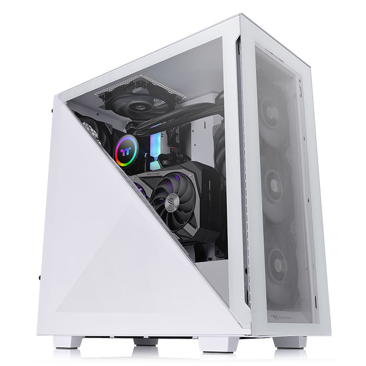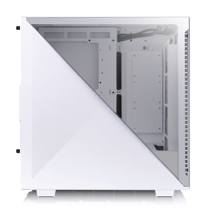 The Divider 300 TG Snow features two 3mm tempered glass windows at the front and on the left side. The exceptional feature of the Divider 300 TG Snow Mid Tower Chassis is the two symmetrical triangular pieces comprised of steel panel and tempered glass. These panels are tool-free and easy to remove, offering a clear view of the components inside.