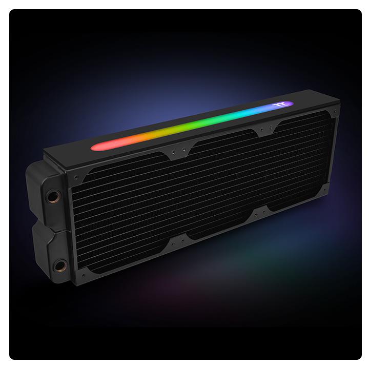 The Pacific CL360 Plus RGB Radiator is a high-performance 360mm copper radiator with high-density copper fin design,brass tank and a software-controllable 16.8 million colors LED strip.Built for 120mm high-static pressure fans,the radiator is manufactured from premium-quality materials that provide exceptional performance,unrivalled reliability.The unique stainless steel side panels guarantee the durability as well as reduce the weight of the radiator.Integrated G1/4" threads make it easy to install, while rigid connections ensure leak-resistant measures are in place. With an ideal mounting, fitting, flow set-up and compatible with TT RGB Plus software, the Pacific CL360 Plus RGB Radiator cools your system with RGB style.
