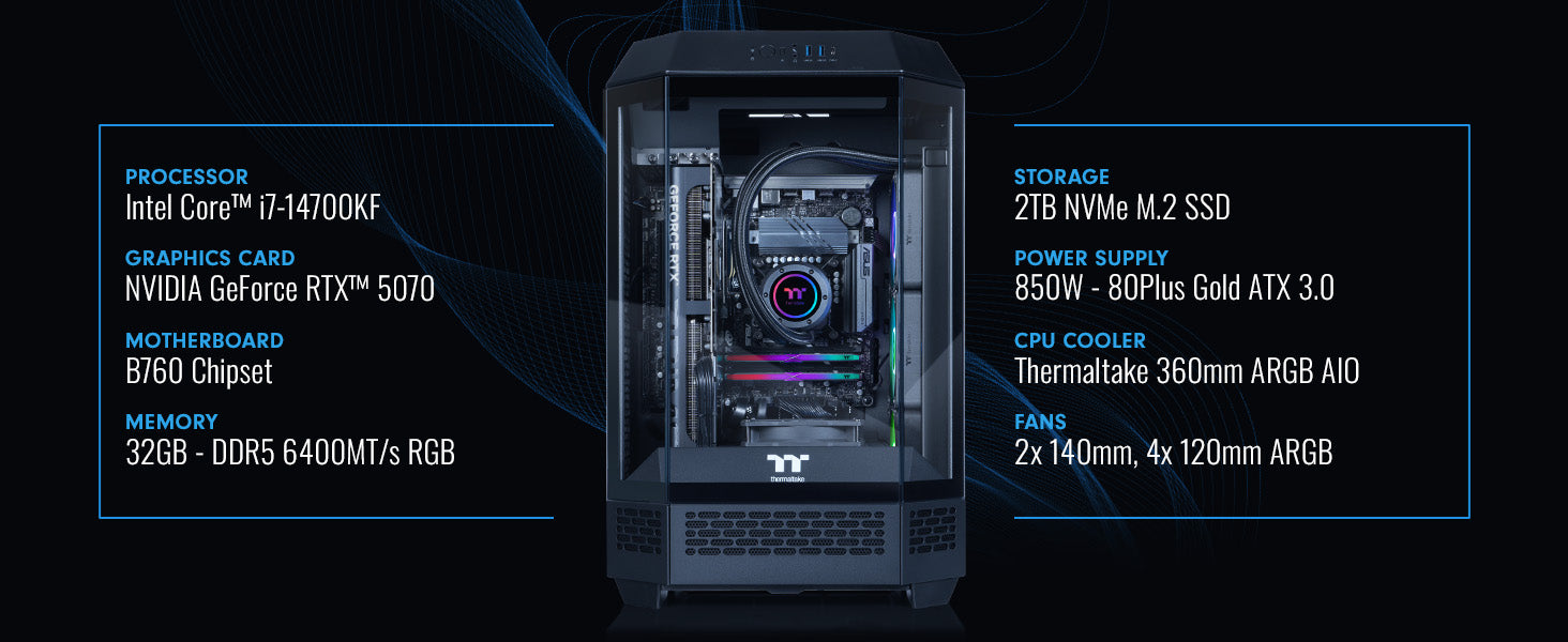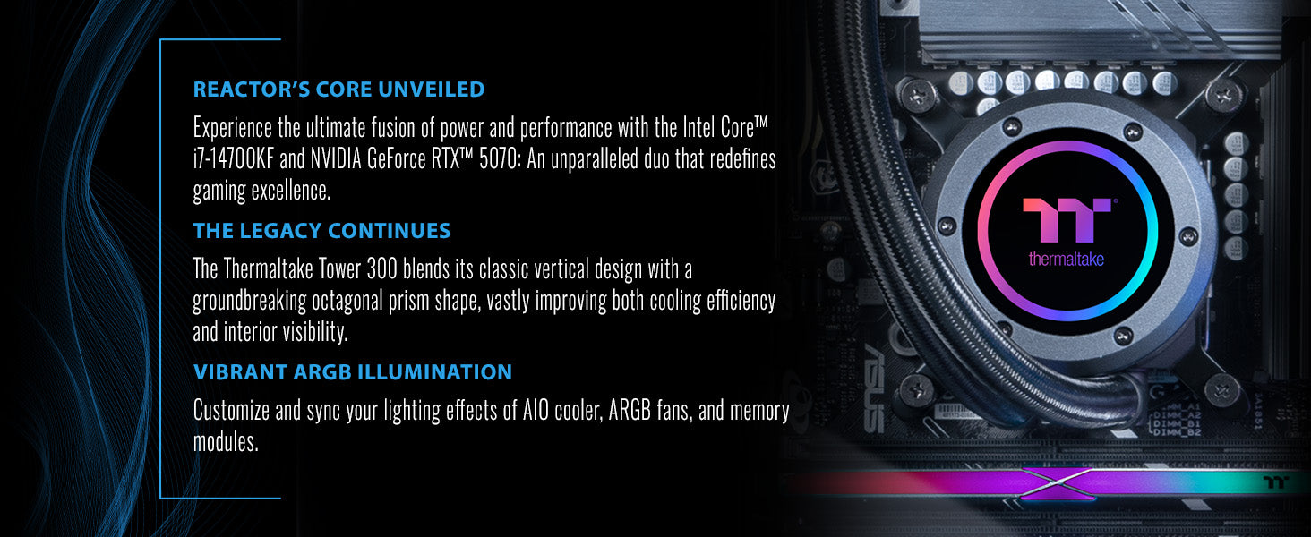 What better way to power your battle station than the Reactor i1470. Its unique octagonal prism shape isn't just a statement piece; it's a testament to innovation, designed to offer superior cooling and performance. Powered by the formidable i9-14900KF CPU and the revolutionary RTX 5070 GPU, this gaming behemoth delivers unmatched performance for an immersive gaming experience. With 32GB of high-speed 6000MT/s Memory and a massive 1TB NVMe SSD, say goodbye to load times and hello to instant action.