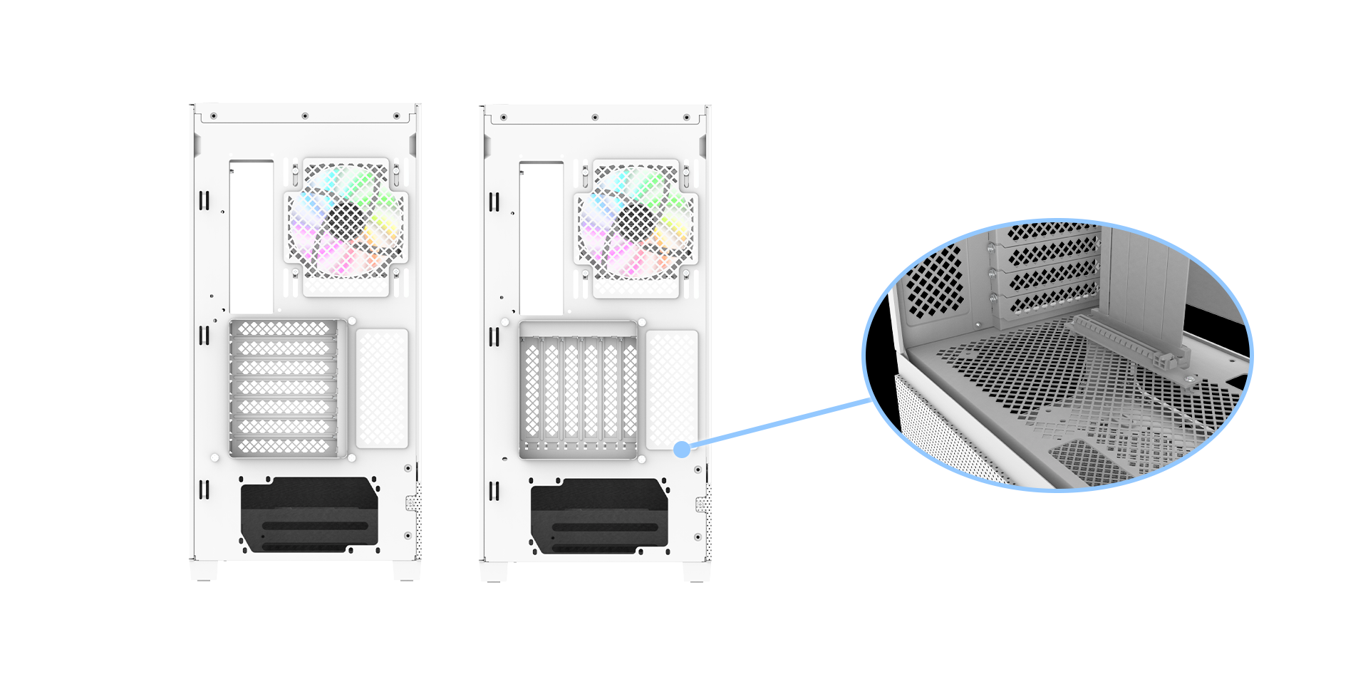 The View 290 TG ARGB Snow Mid Tower Chassis features a full length power supply cover providing plenty of space to tuck away cables, while keeping airflow clear for your hard drives and PSU.