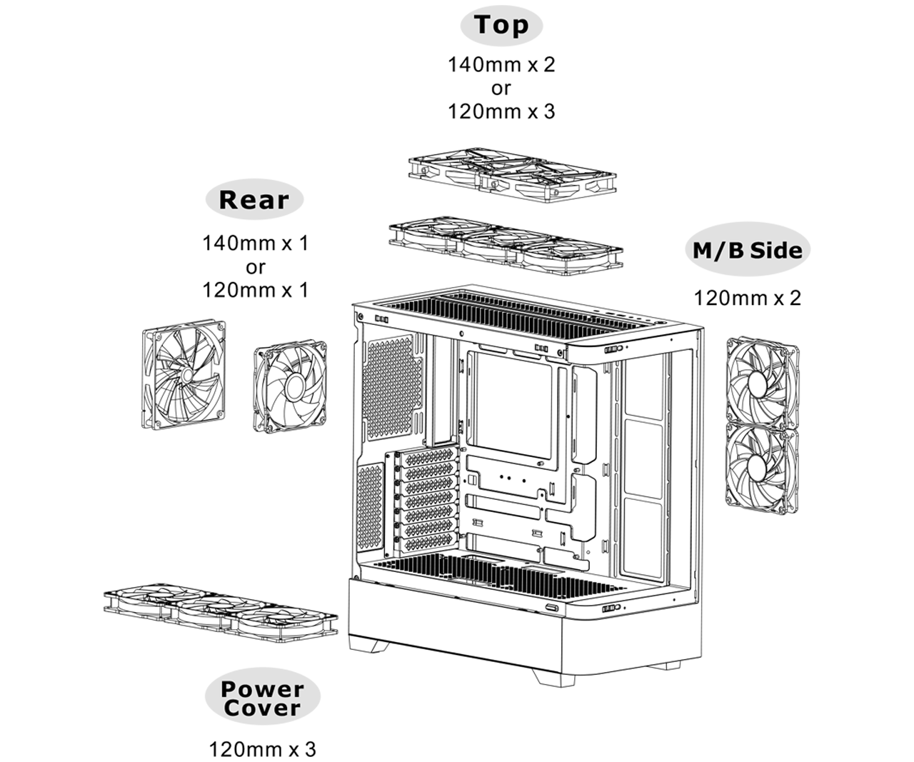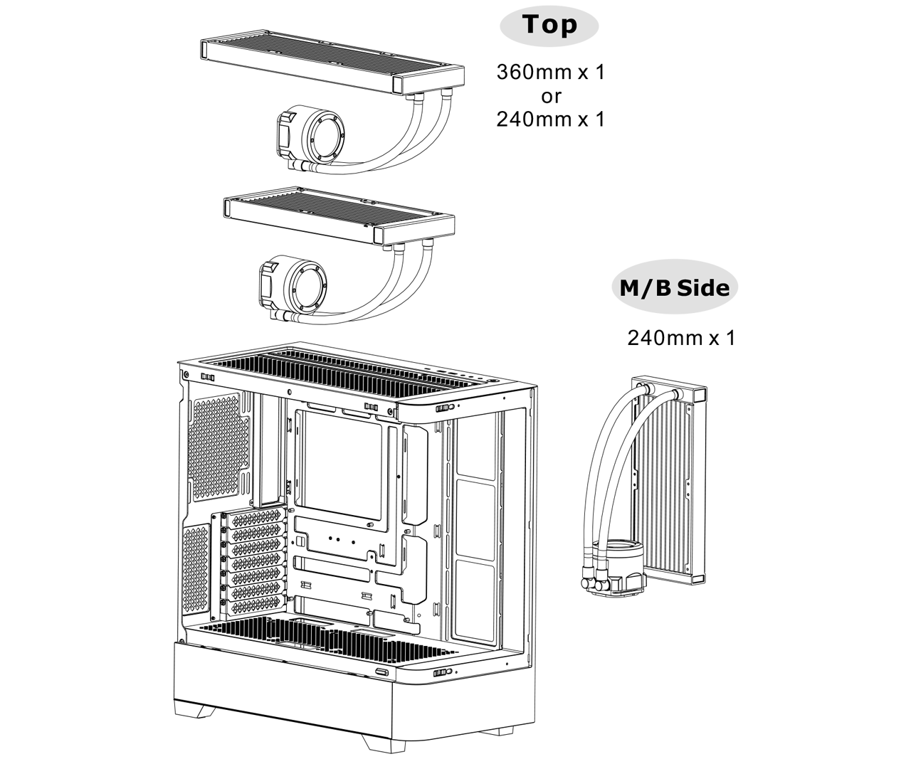 Providing good cooling support, users can choose to place a 360mm radiator on the top of the chassis.