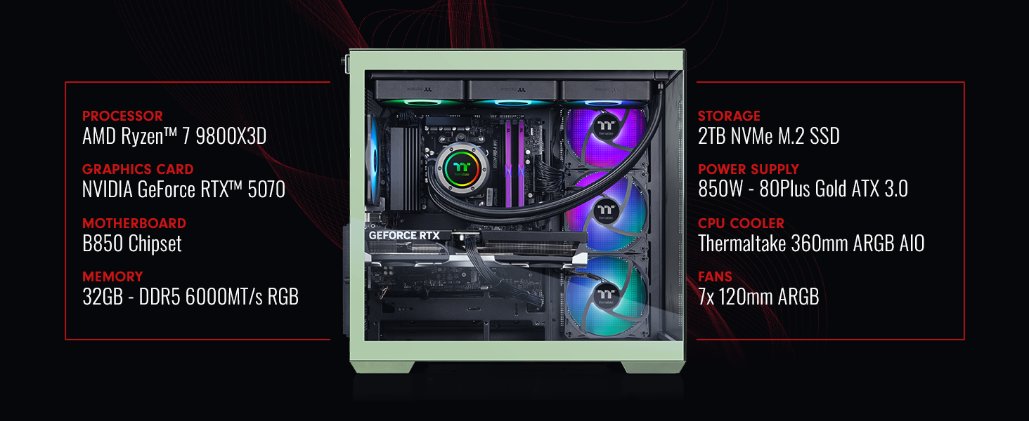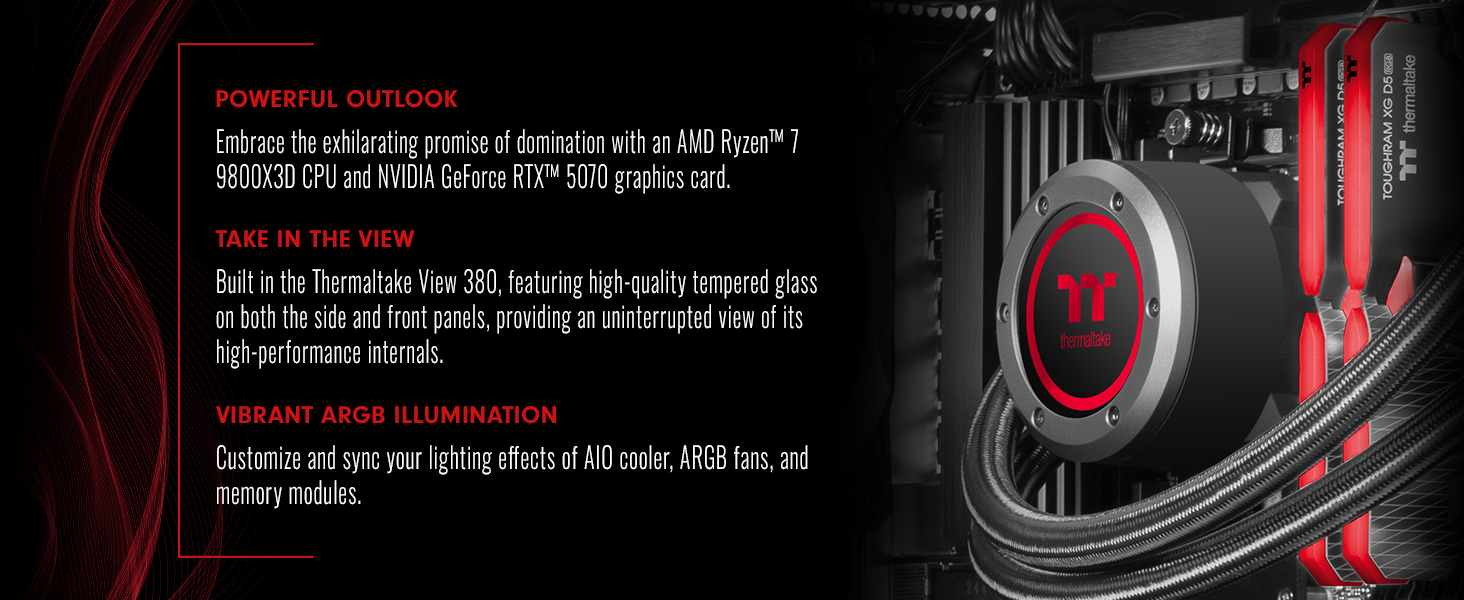 Discover the View series, where elite performance meets stunning design. Encased in edge-to-edge tempered glass, the View 9870M-380 features a dual chamber design that provides ample space to showcase its powerful internals, including an AMD Ryzen™ 7 9800X3D processor and NVIDIA® GeForce RTX™ 5070 graphics card. Experience blazing-fast load times with a 2TB NVMe SSD, seamless multitasking with 32GB DDR5 memory. Enhanced with a 360mm AIO cooler for optimal temperature control, the View Series combines aesthetic elegance with advanced gaming technologies.