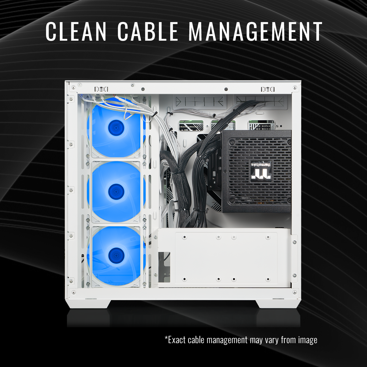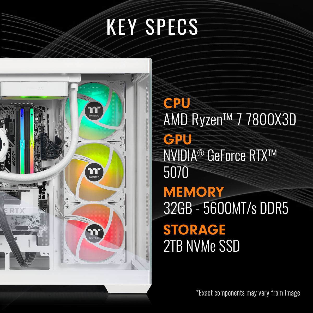 Discover the Vista series, where elite performance meets stunning design. Encased in edge-to-edge tempered glass, the Vista 470S features a dual chamber design that provides ample space to showcase its powerful internals, including a AMD Ryzen™ 7 7800X3D processor and NVIDIA® GeForce RTX™ 5070 graphics card. Experience blazing-fast load times with a 2TB NVMe SSD, seamless multitasking with 32GB DDR5 memory, and optimal temperature control with a 240mm AIO cooler.