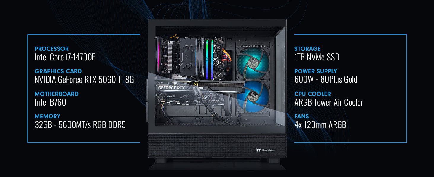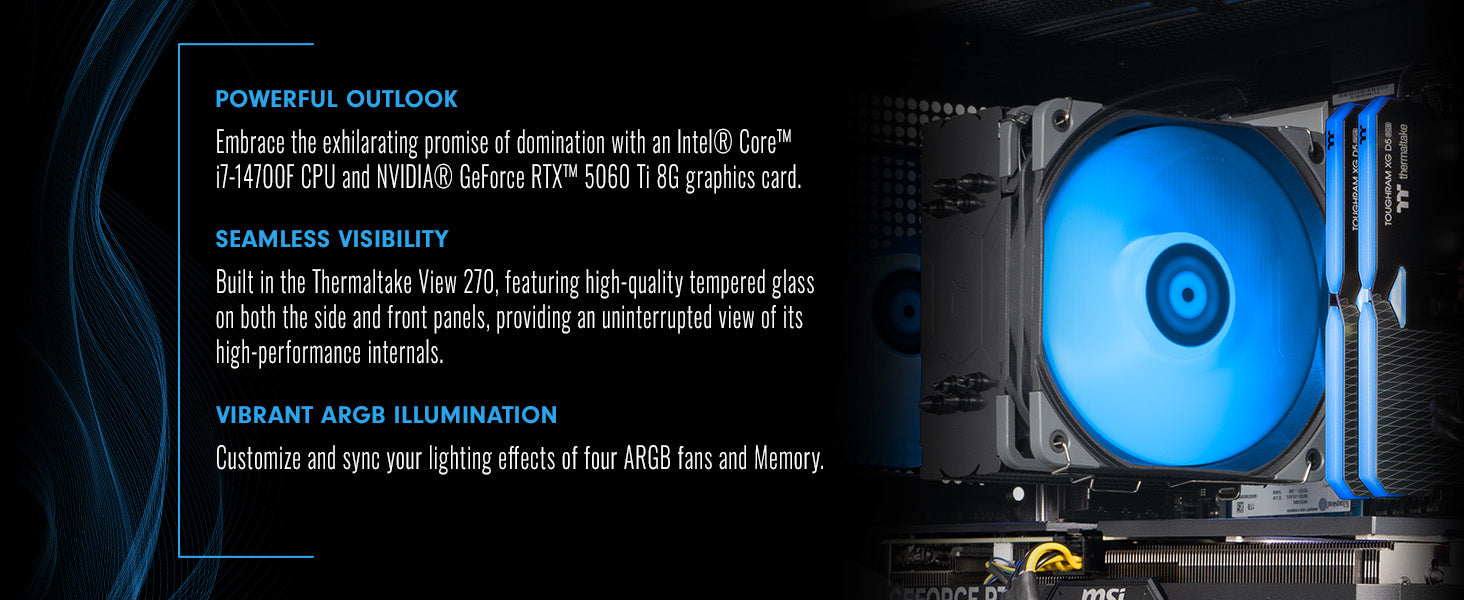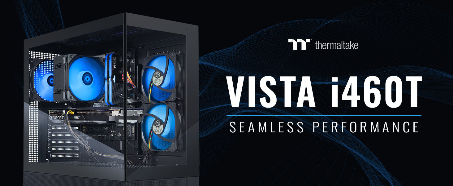 Discover the Vista series, where elite performance meets stunning design. Encased in edge-to-edge tempered glass, the Vista i460T showcases its powerful internals, including an Intel® Core™ i7-14700F CPU and NVIDIA® GeForce RTX™ 5060 Ti 8G graphics card. Experience blazing-fast load times with a NVMe SSD and seamless multitasking with 32GB DDR5 memory. With a ARGB tower air cooler enhancing both visual flair and thermal efficiency, the Vista Series combines aesthetic elegance with advanced gaming technologies.
