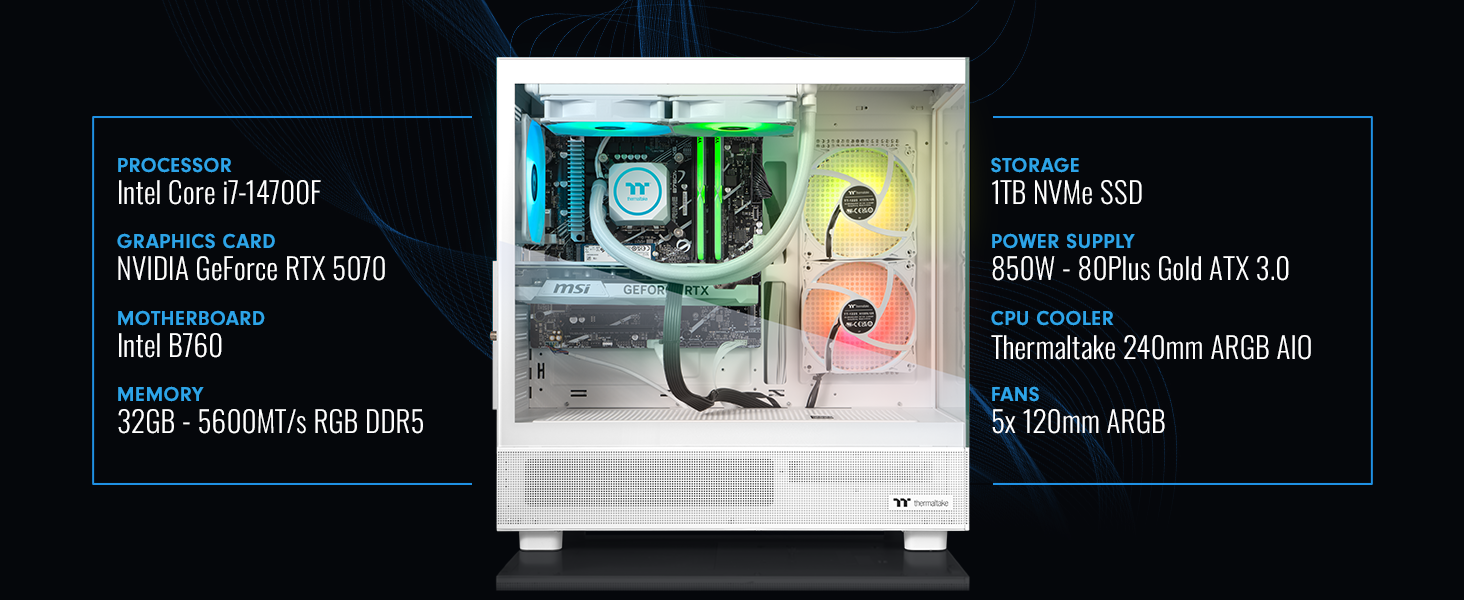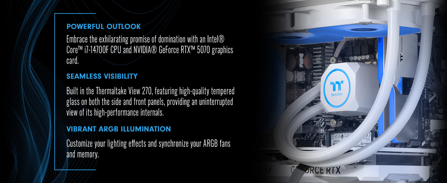 Discover the Vista series, where elite performance meets stunning design. Encased in edge-to-edge tempered glass, the Vista i470S showcases its powerful internals, including an Intel® Core™ i7-14700F CPU and NVIDIA® GeForce RTX™ 5070 graphics card. Experience blazing-fast load times with a 1TB NVMe SSD and seamless multitasking with 32GB DDR5 memory. Enhanced with a 240mm AIO cooler for optimal temperature control, the Vista Series combines aesthetic elegance with advanced gaming technologies.